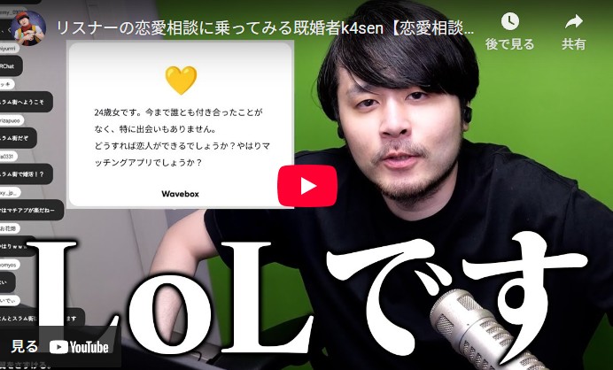 本ミームの出展元は、既婚者である配信者k4senのYouTube恋愛相談枠である。